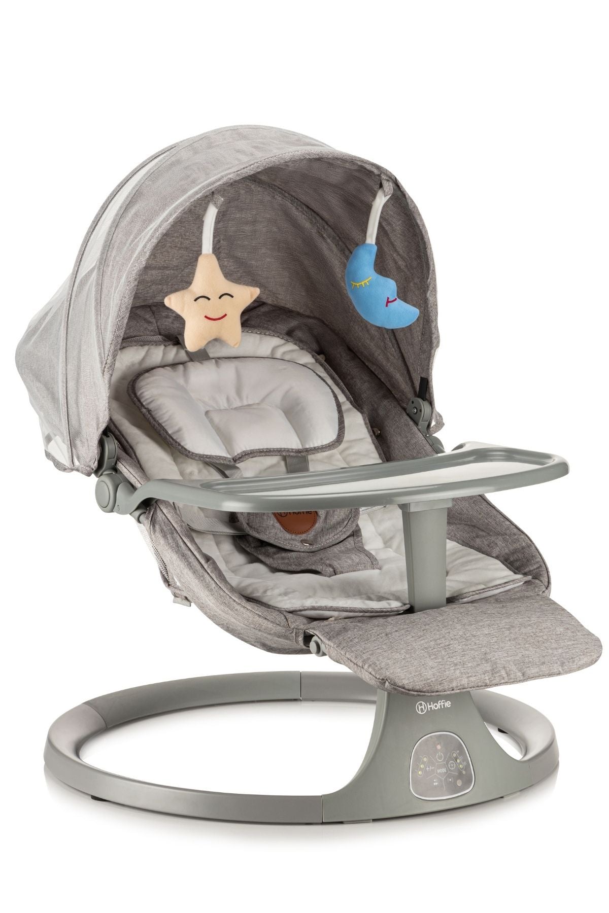 Hoffie Velaro Plus bebek ana kucağı, doğumdan itibaren kullanılabilen, modern ebeveynler için özel olarak tasarlanmış elektrikli, otomatik sallanabilen bir bebek ana kucağı modelidir. 5 farklı sallanma modu, Bluetooth bağlantısı, oyuncaklı tente sistemi ve uzaktan kumanda kontrolüyle, hem bebek hem ebeveynler için maksimum konfor ve kolaylık sağlar.